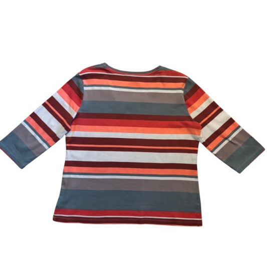 Vintage Sun and Moon Patch Coral Pink/Green Striped 3/4 Sleeve Cotton V-Neck Top (L-XL)