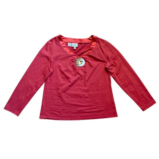 Vintage Sun and Moon Patch Red Satin Trim V-Neck Longsleeve Top (L-XL)
