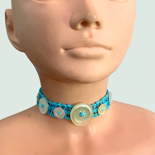Pearlescent Button Embellished Handknit Turquoise Cotton Choker Necklace