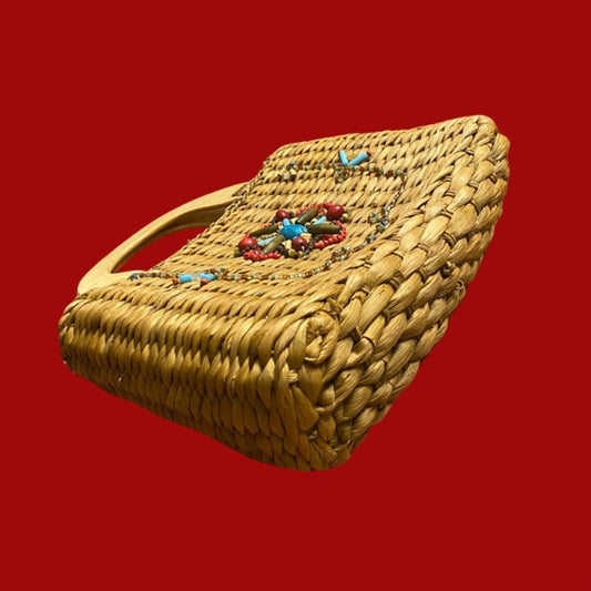Vintage Mock Turquoise & Coral Beaded Tan 100% Straw Handbag