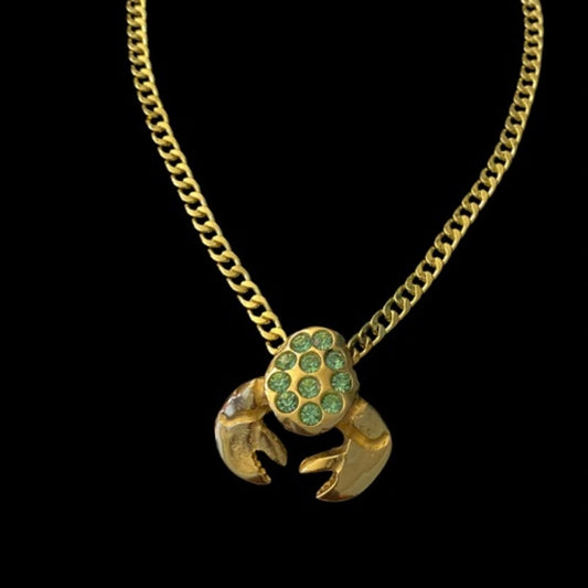 Emerald Rhinestone Studded Crab Pendant Stamped 18 Karat Yellow Gold Chain Necklace