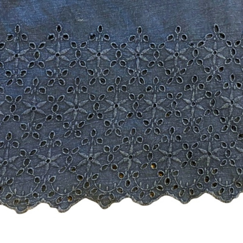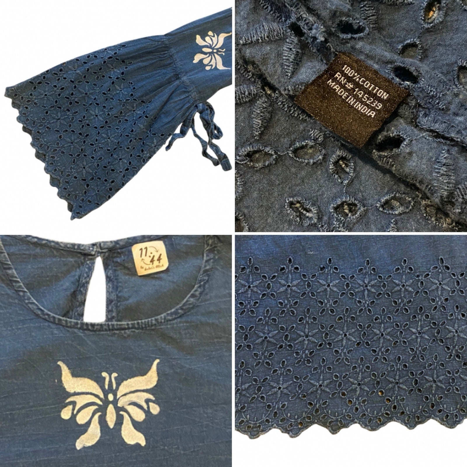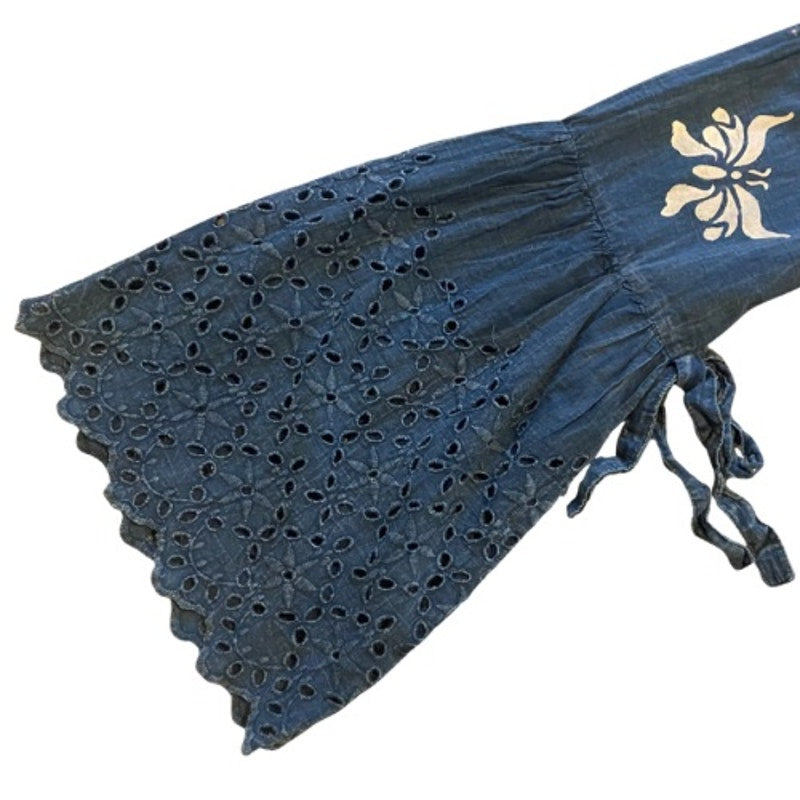 Breezy Indigo Blue & White Butterfly Bell Sleeve Lace Hem Cotton Blouse (M)