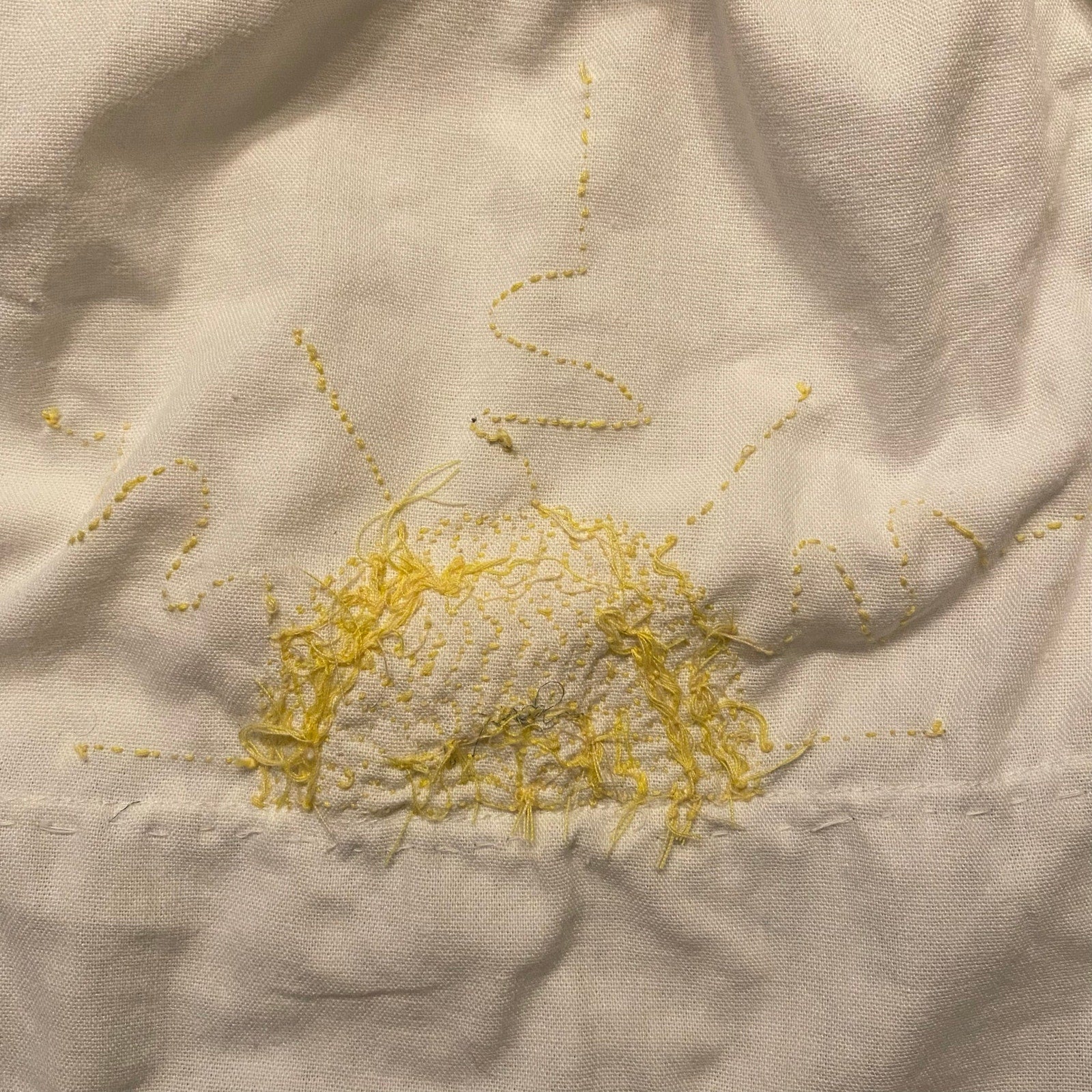 - Embroidered yellow sun with squiggly rays and faraway birds