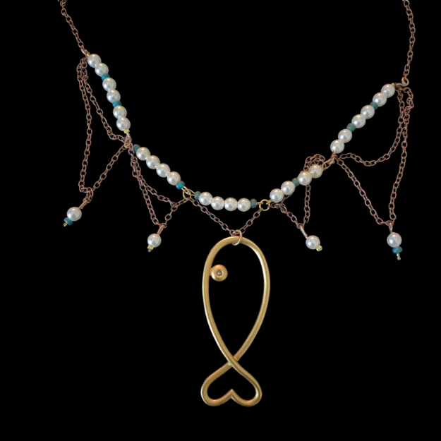 - Vintage gold toned metal fish pendant from the 1990’s (maker unknown). Added pearl bead eye for extra whimsy.
