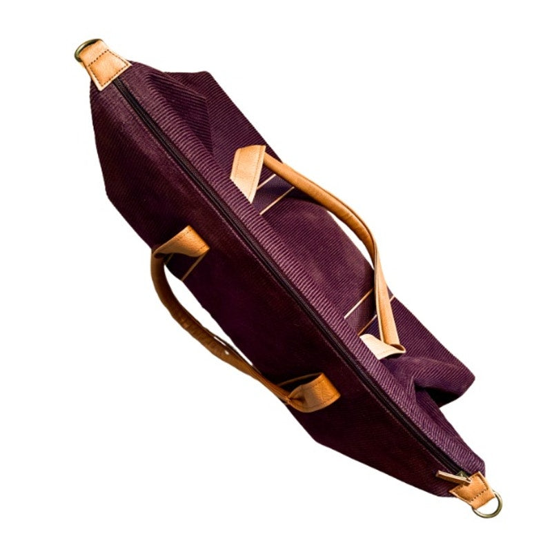 Large Maroon Corduroy Tan Faux Leather Weekender Bag with Adjustable Shoulder Strap