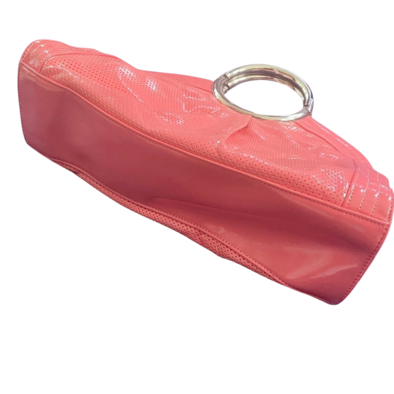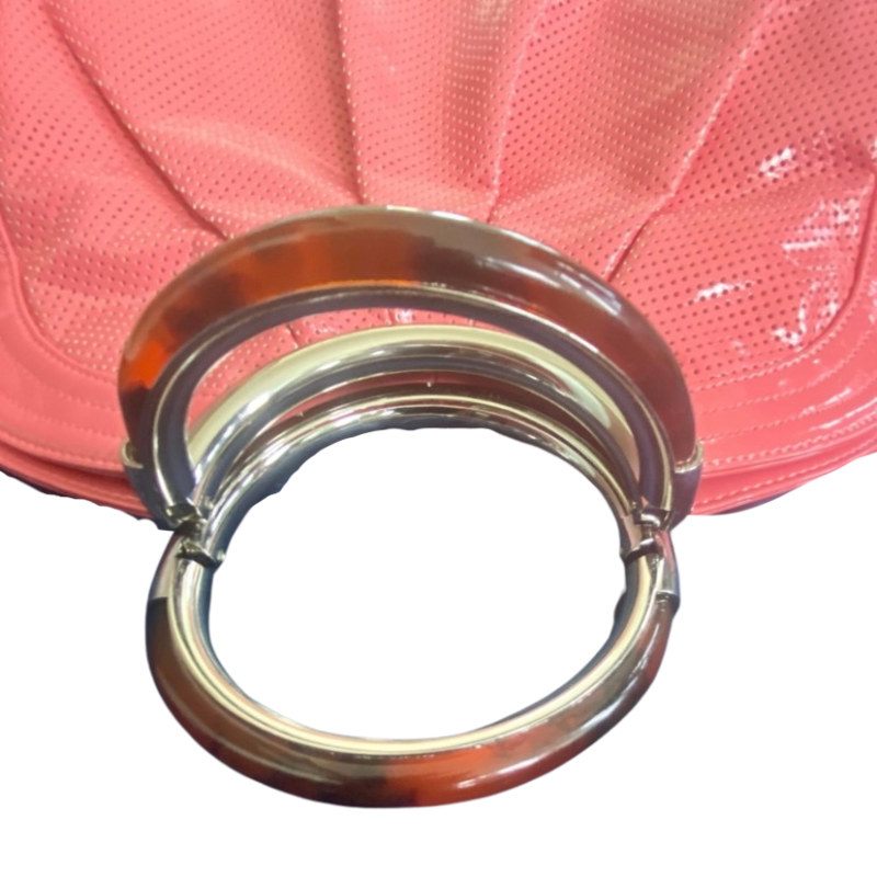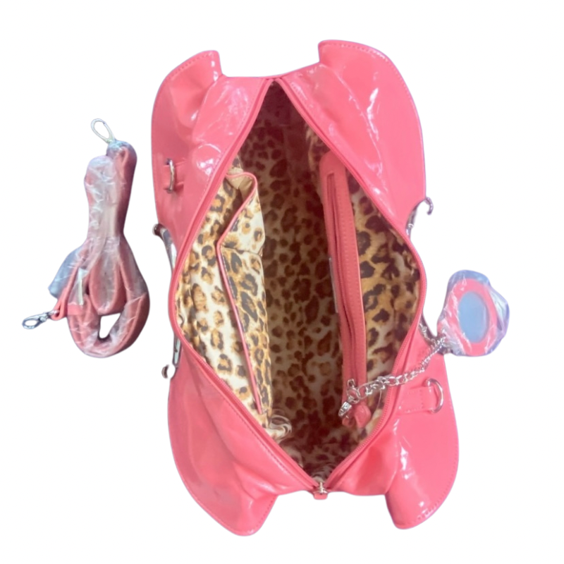 NWOT Coral Pink Faux Leather Tortoiseshell Handle Handbag with Leopard Print Lining, Removable Strap, Mirror