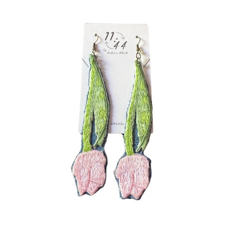 Upcycled Vintage Pink Tulip Embroidered Patch + Jean Earrings (Upside Down)