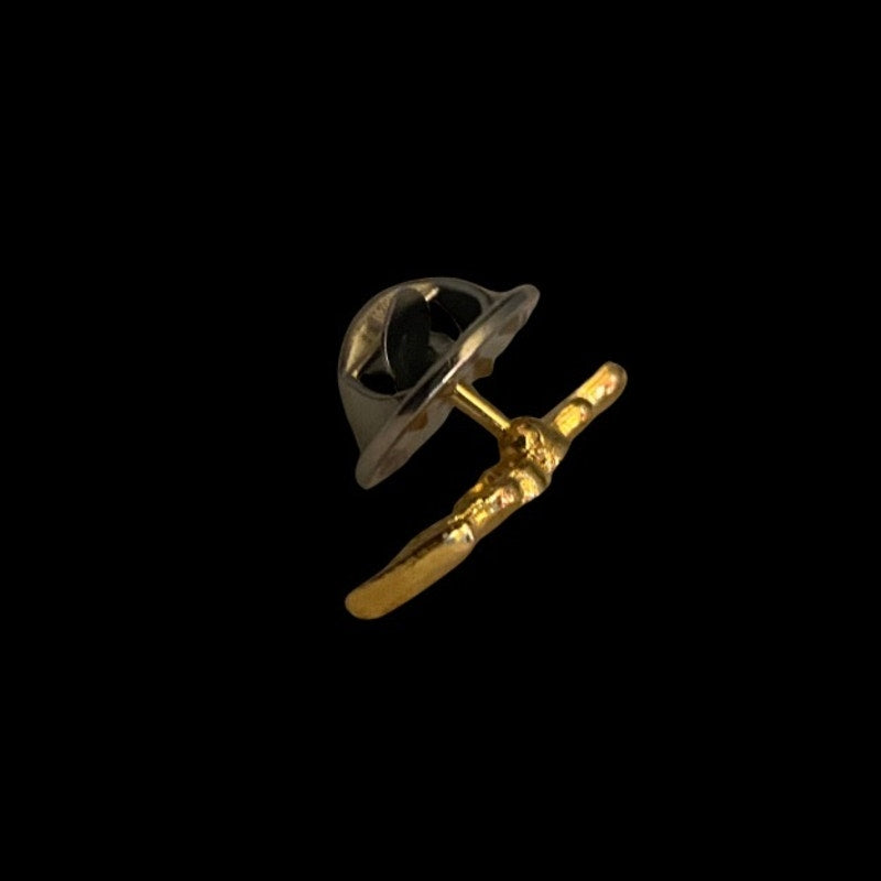 - This pin has gold capital letters and red heart replacing the “O” in “mom”