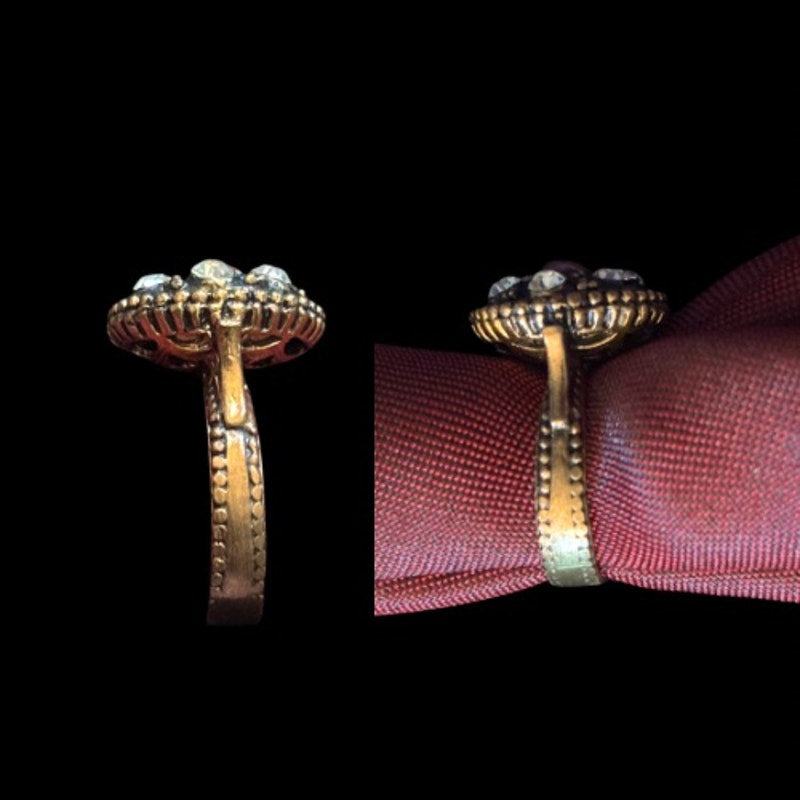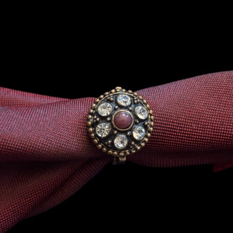 Y2K Ottoman Rose Shaped Mock Ruby & Diamente Bronze Circular Drop Earrings, Pendant, & Ring Jewelry Set